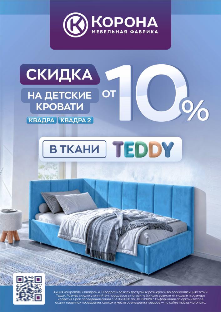С 13 марта по 31 мая 2026 года включительно действует специальное предложение на детские кровати Quadra (Квадра) и Quadra 2 (Квадра 2). При заказе любой модели из этих серий, обшитой мягкой тканью Teddy, предоставляется скидка от 10%.